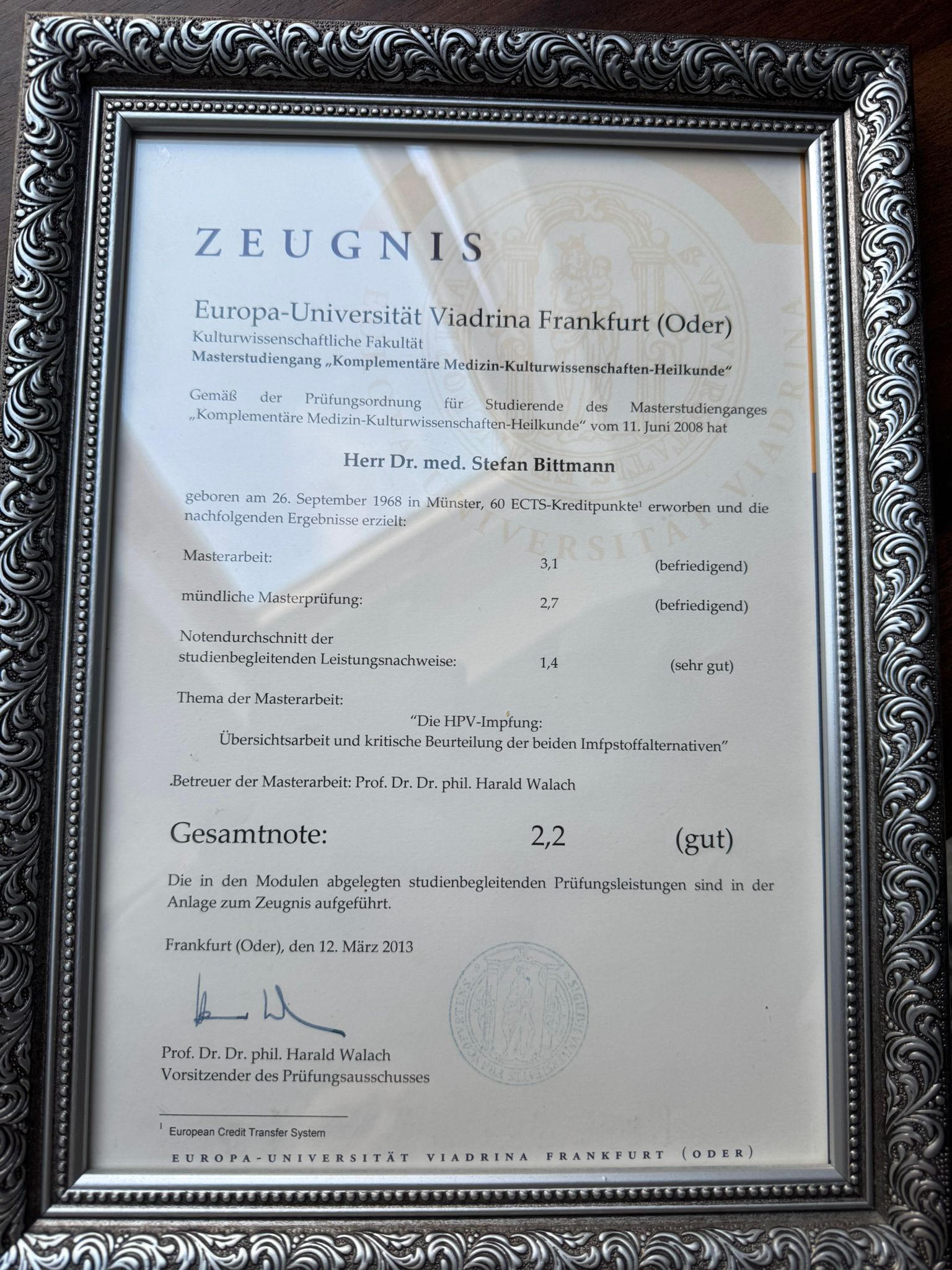 Neben regelmäßigen Fortbildungsdiplomen der Kassenärztlichen Vereinigung Westfalen-Lippe zudem Abschluss des Studiums der Schlafmedizin und Schlafkultur an der Apollon Hochschule Bremen im Jahr 2019 (2018-2019).